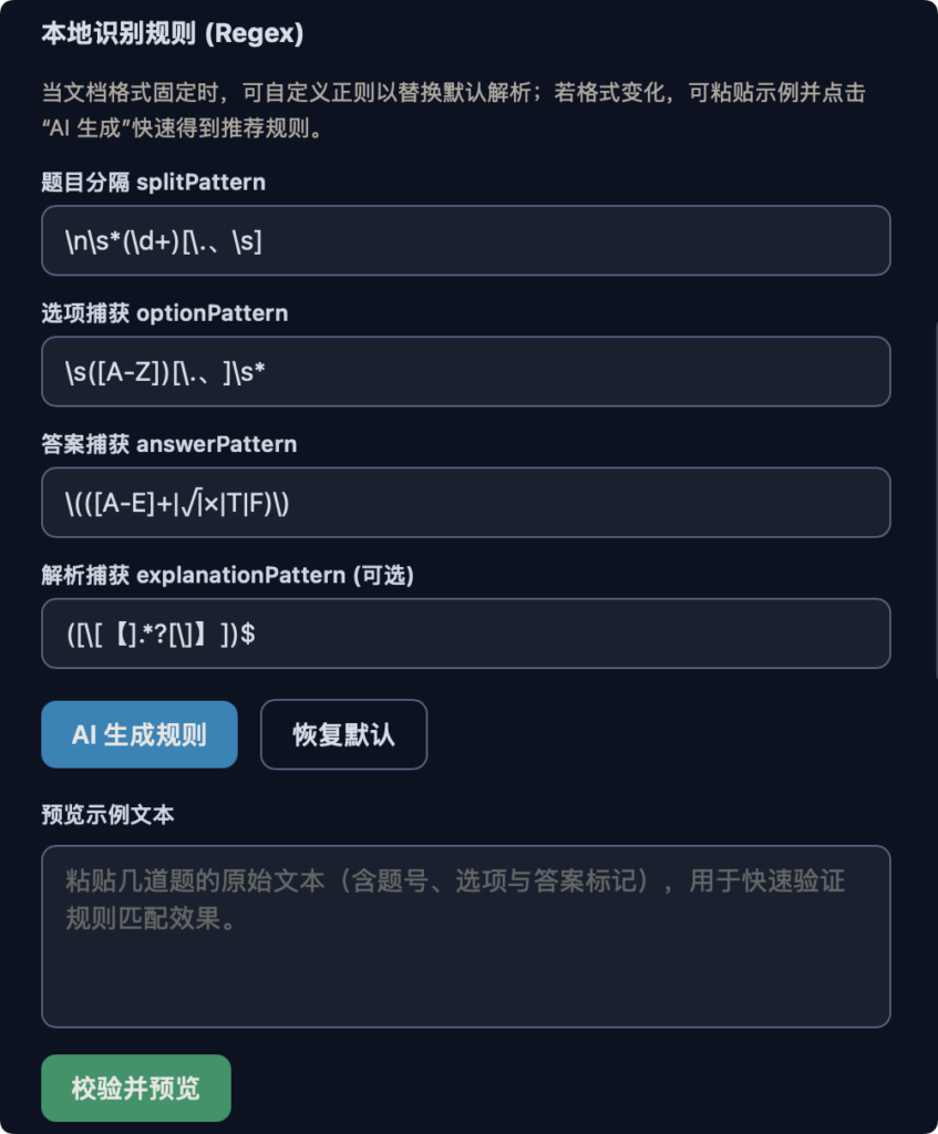 内置标准正则解析器,适合题库格式稳定的文档,速度快、成本低。支持自定义 splitPattern、optionPattern、answerPattern、explanationPattern,并可用 AI 根据样本文本生成建议规则,提升适配效率。